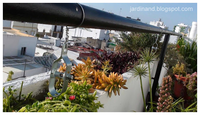 Tengo que aclarar que tiene un metro mas para darle de sombreo que no le llegue a dar, que es el que se ve enrollado en la foto en primer plano, por eso esta cogido aun con pinzas de tender, a la espera de instalar el séptimo y último cable. No lo monté antes porque no estaba segura de querer tener ese metro de mas, pero que probablemente si se lo dé.